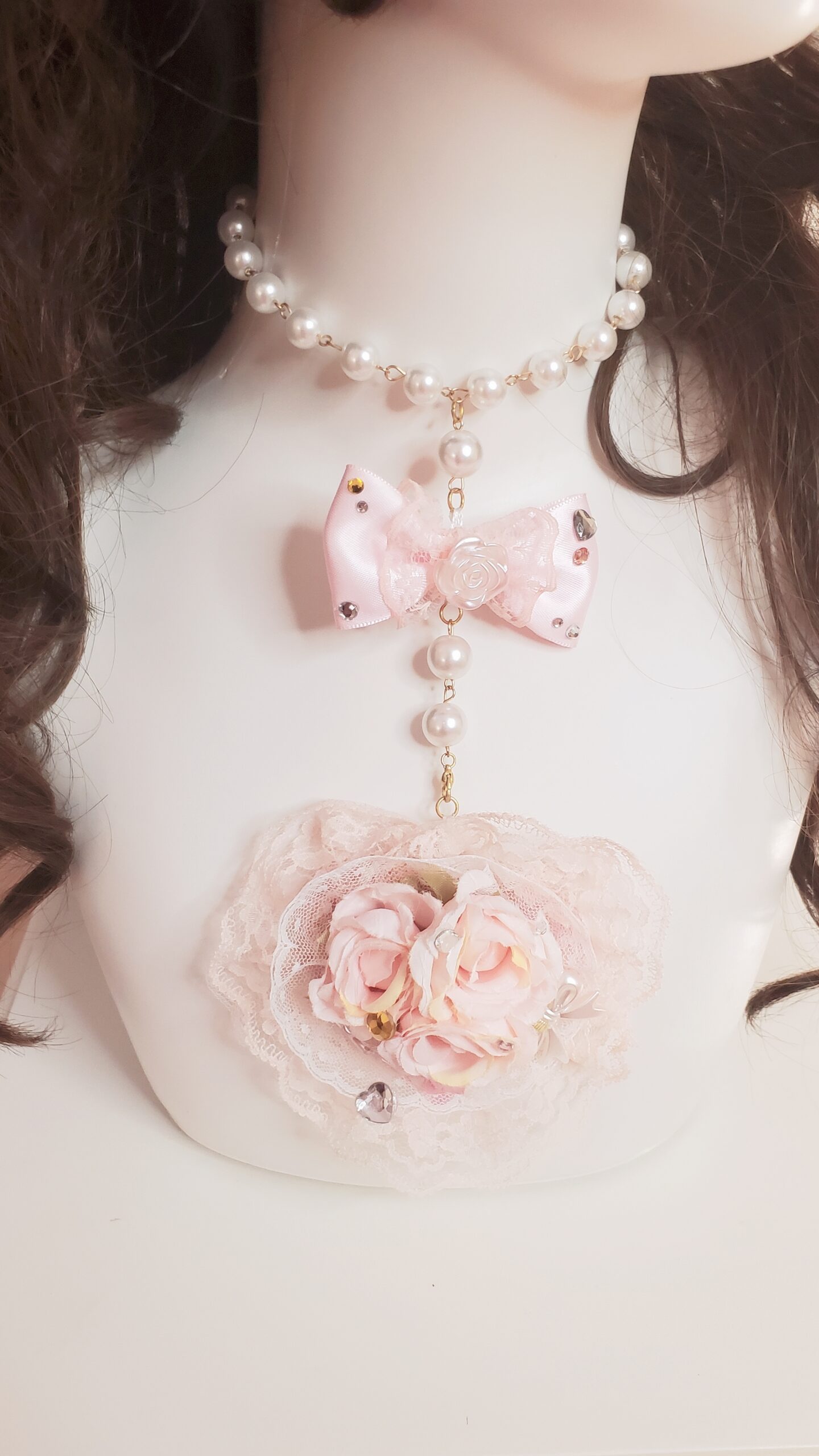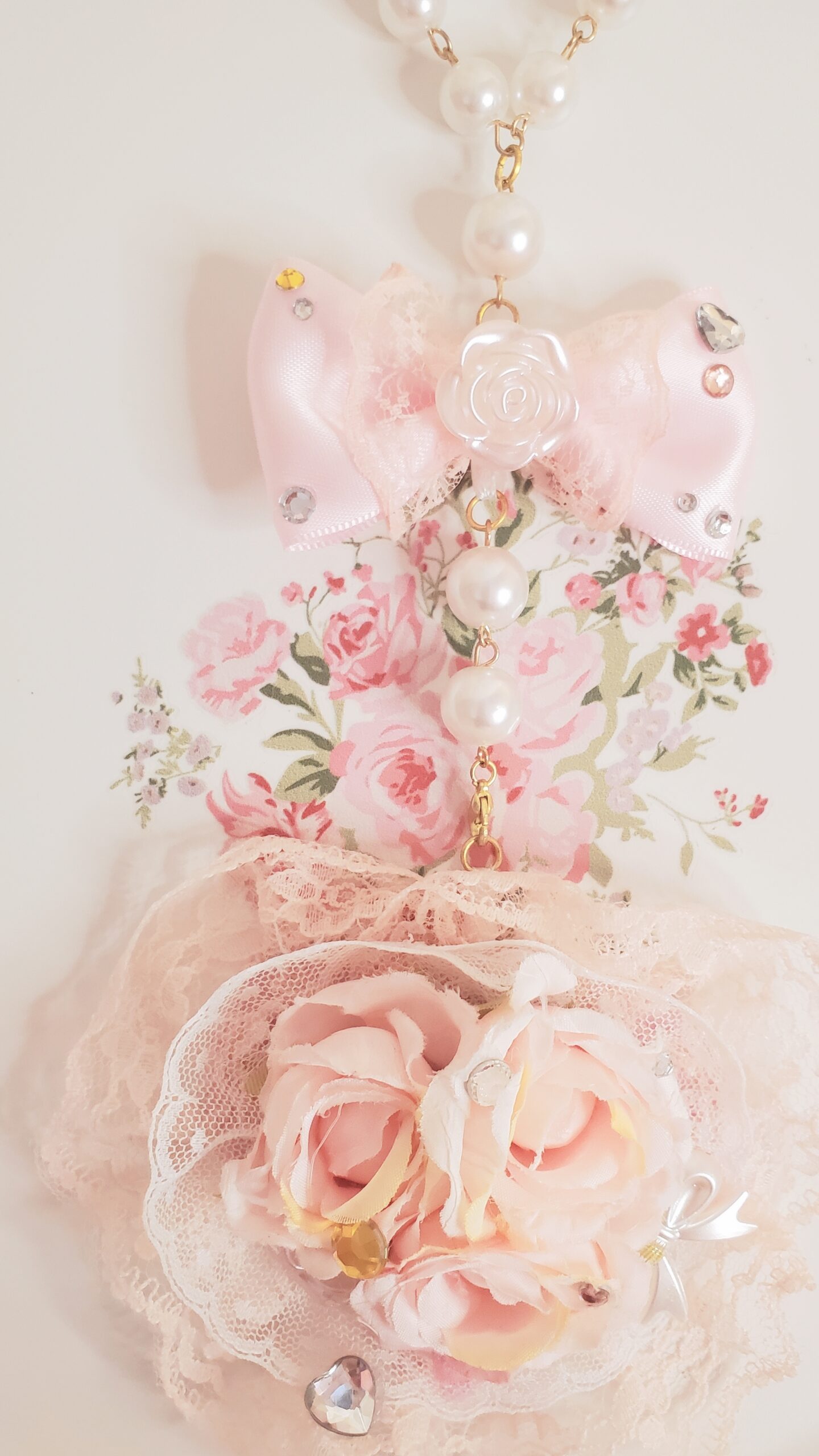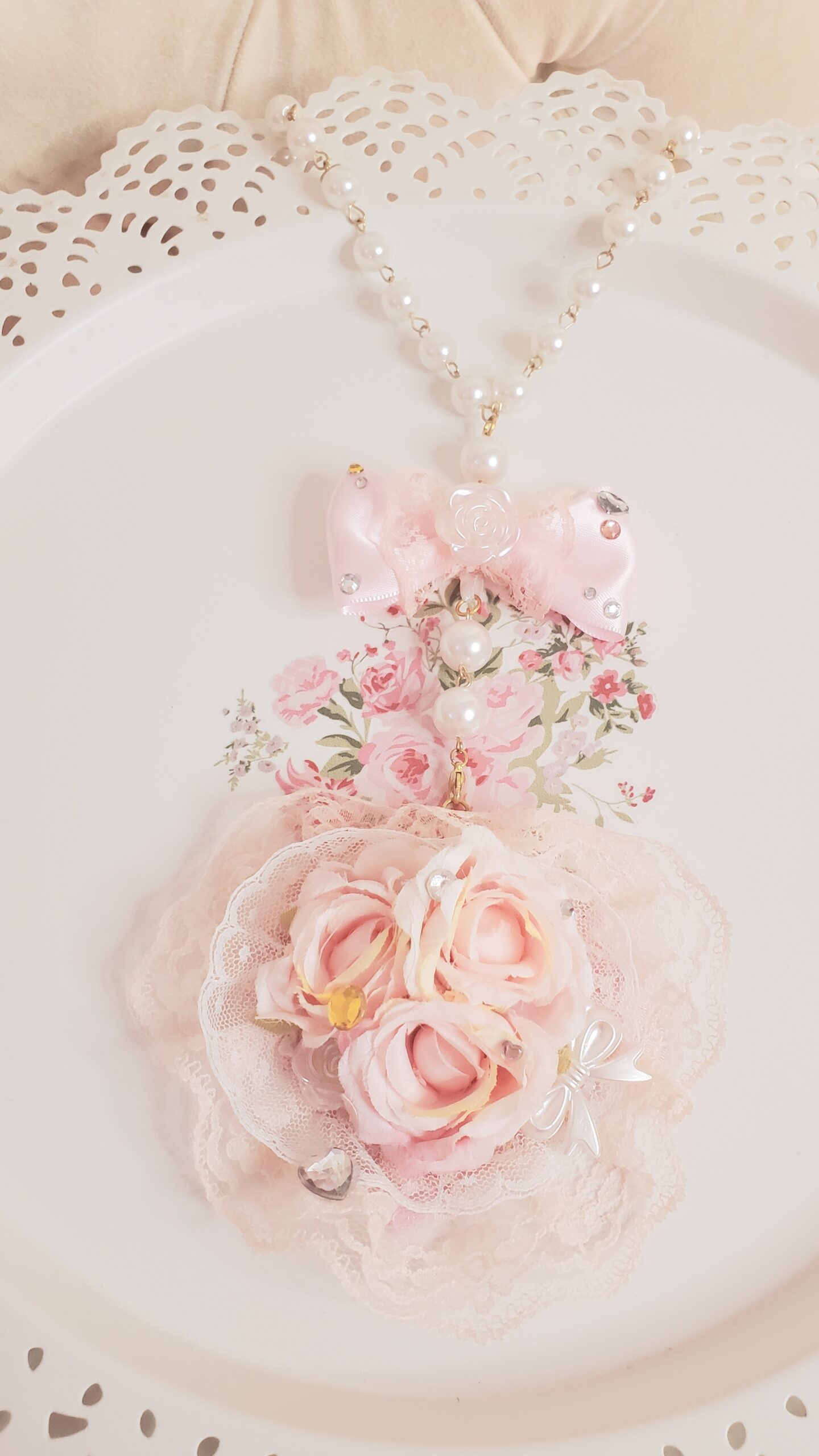 A beautiful necklace featuring a heart-shaped charm covered in roses dangling below a bow adorned in rhinestones. Decorated with plenty of lace with a large pearl chain with an adjustable length. The heart charm can be removed to swap out for a different one for multiple looks!