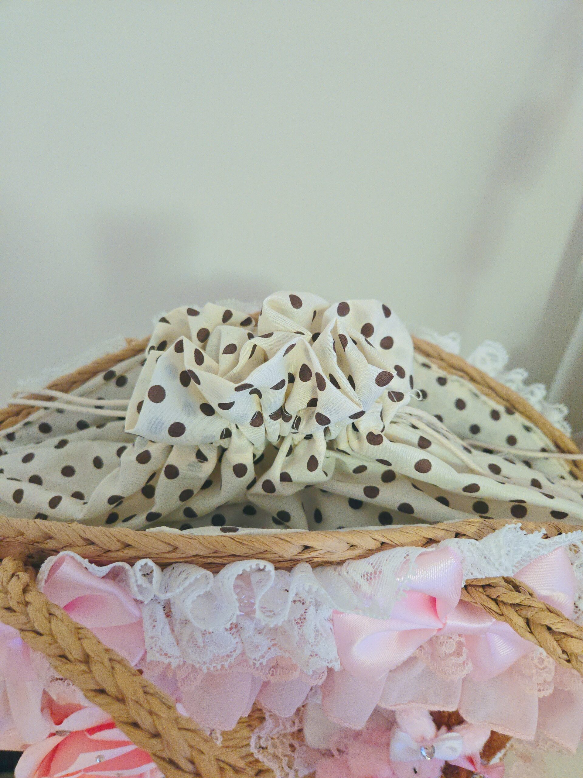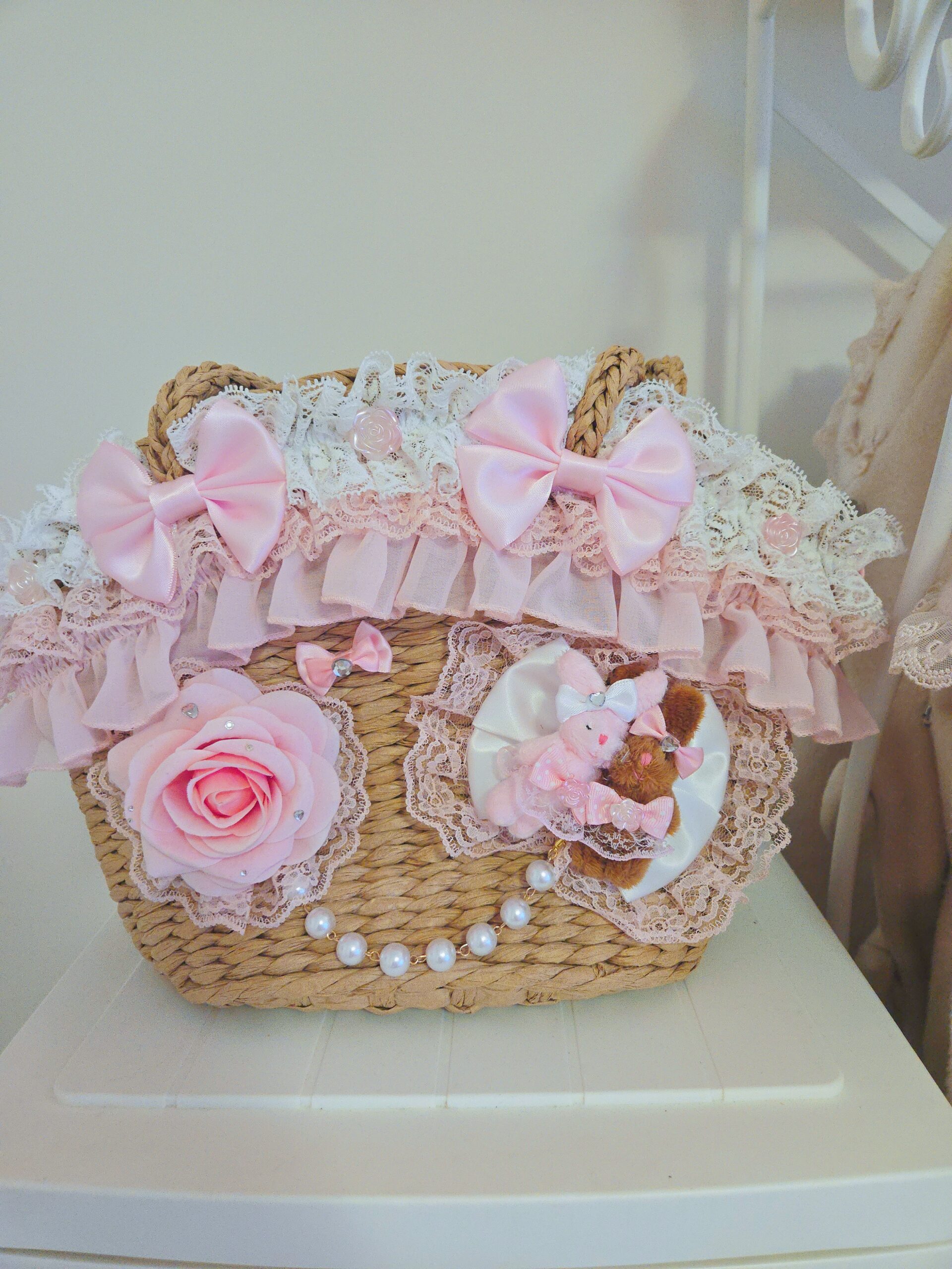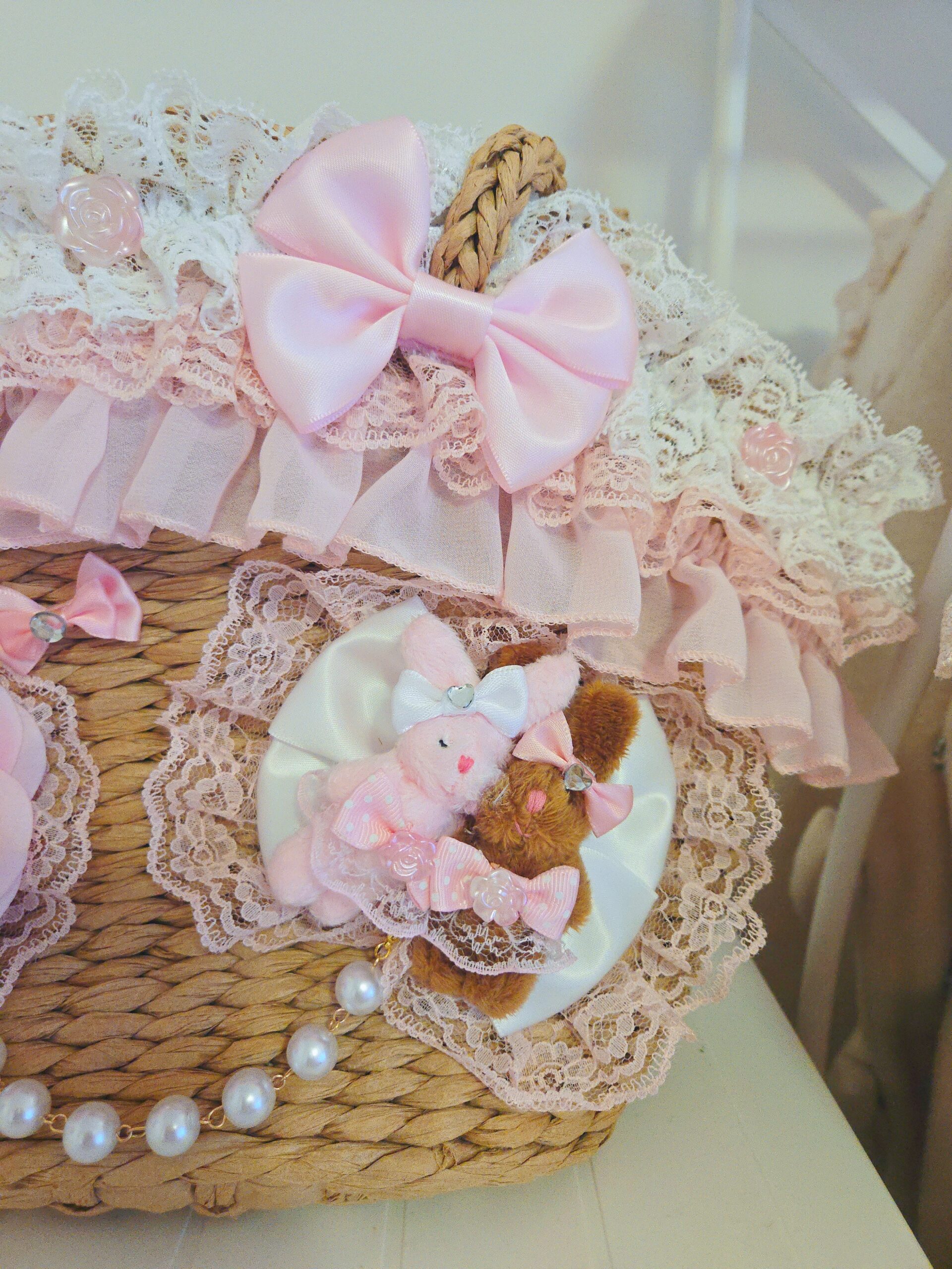 Handmade and made to order, this cute bag is covered with ribbons, lace and bows and features two bunnies dressed up together on a big bow! It can be customized the way you like or made just like the picture! Made of woven soft, yet stiff natural fibers, this tote bag itself features drawstring closure with adorable polka dot lining and an inner pocket for storage.