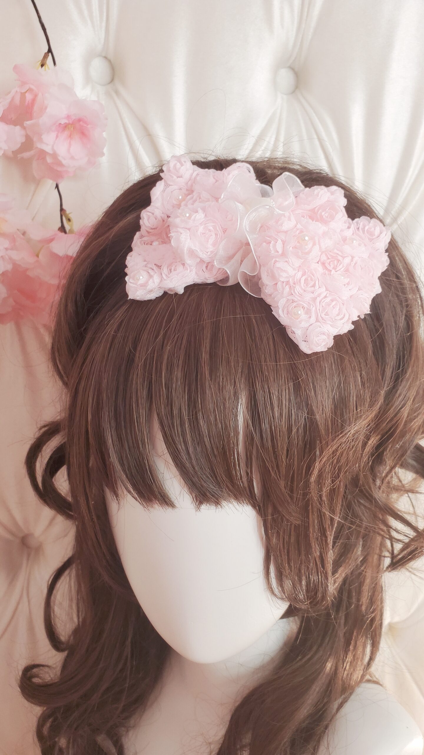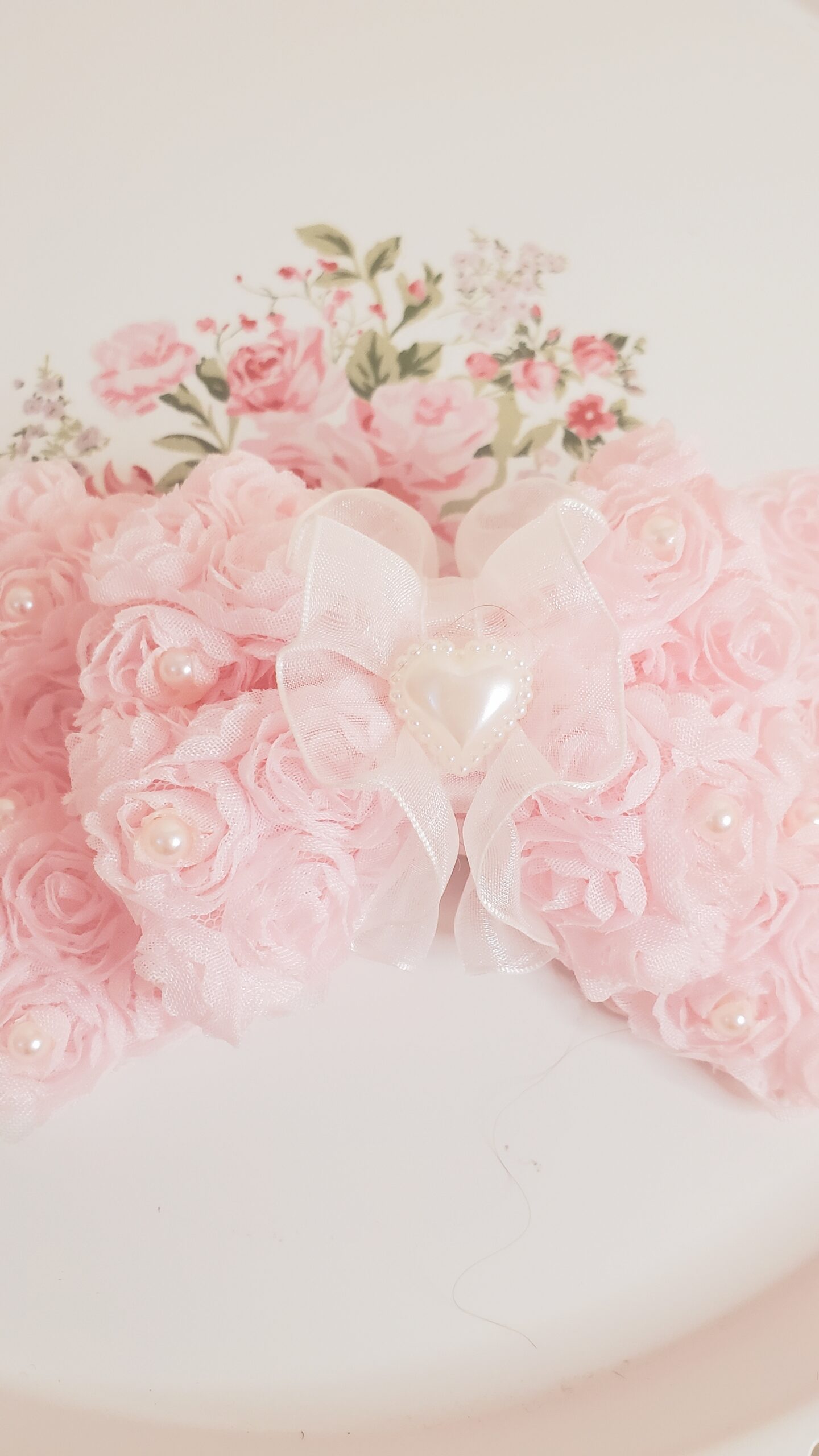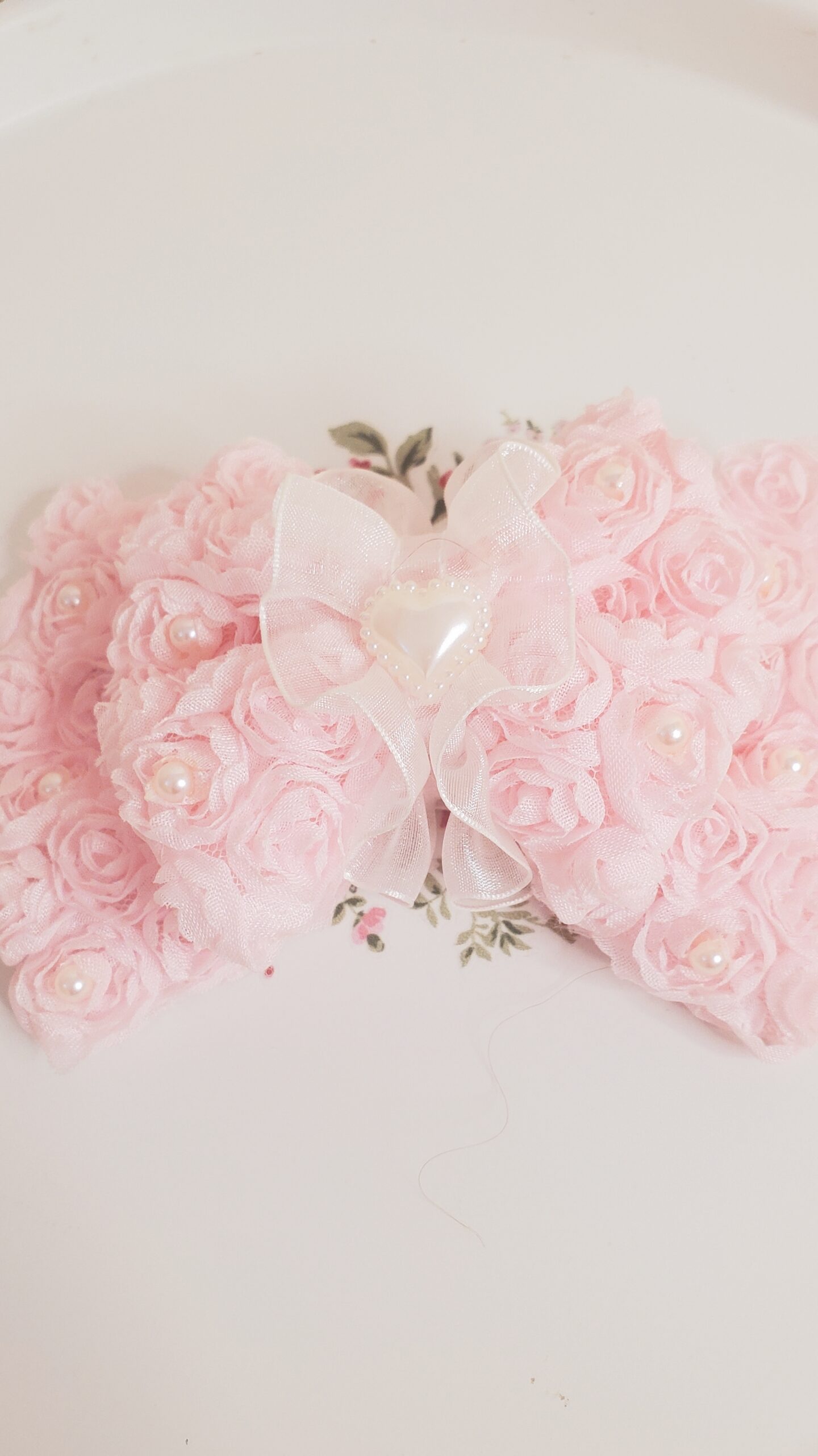 Beautiful made with rose patterned tulle decorated with pearls and chiffon lace. A larger sized bow that’s perfect to add to any outfit.