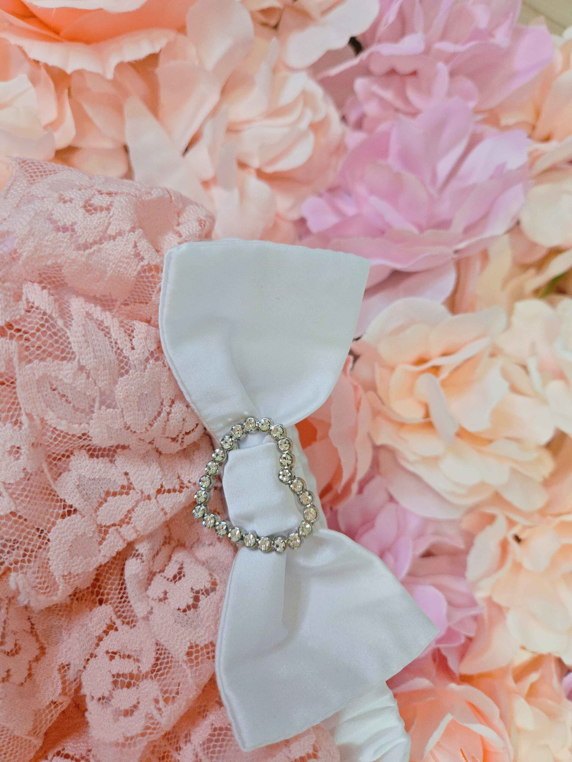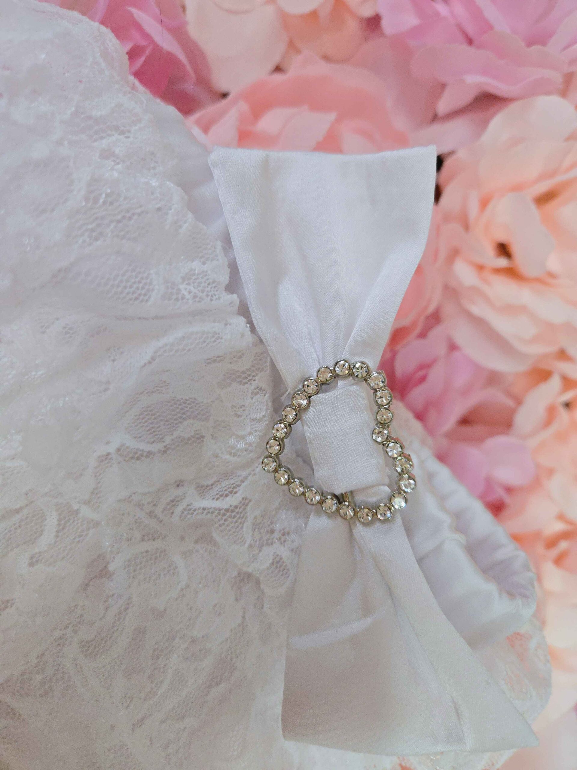 Adorable leg warmers in two beautiful colors that are perfect for any wardrobe. Made with soft lace and satin with elastic for comfort and removable bows with a rhinestone heart design!  They also match perfectly with our sugar denim dress ☆